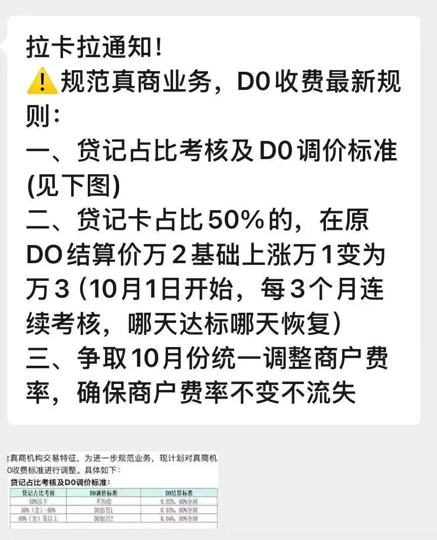 今天一大早,支付圈的同行群简直像扔了个鞭炮,瞬间炸开了锅!主角还是咱们行业的“老大哥”拉卡拉——一纸通知下来,核心就一句话:信用卡刷得太猛的商户,D0(当天到账)费率要涨万分之二!