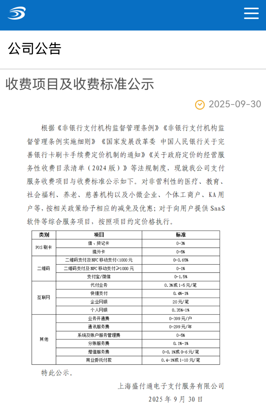 2025年9月30日,上海盛付通电子支付服务有限公司发布《收费项目及收费标准公示》,多个收费项目大幅度调整。