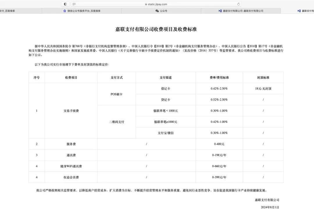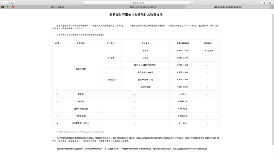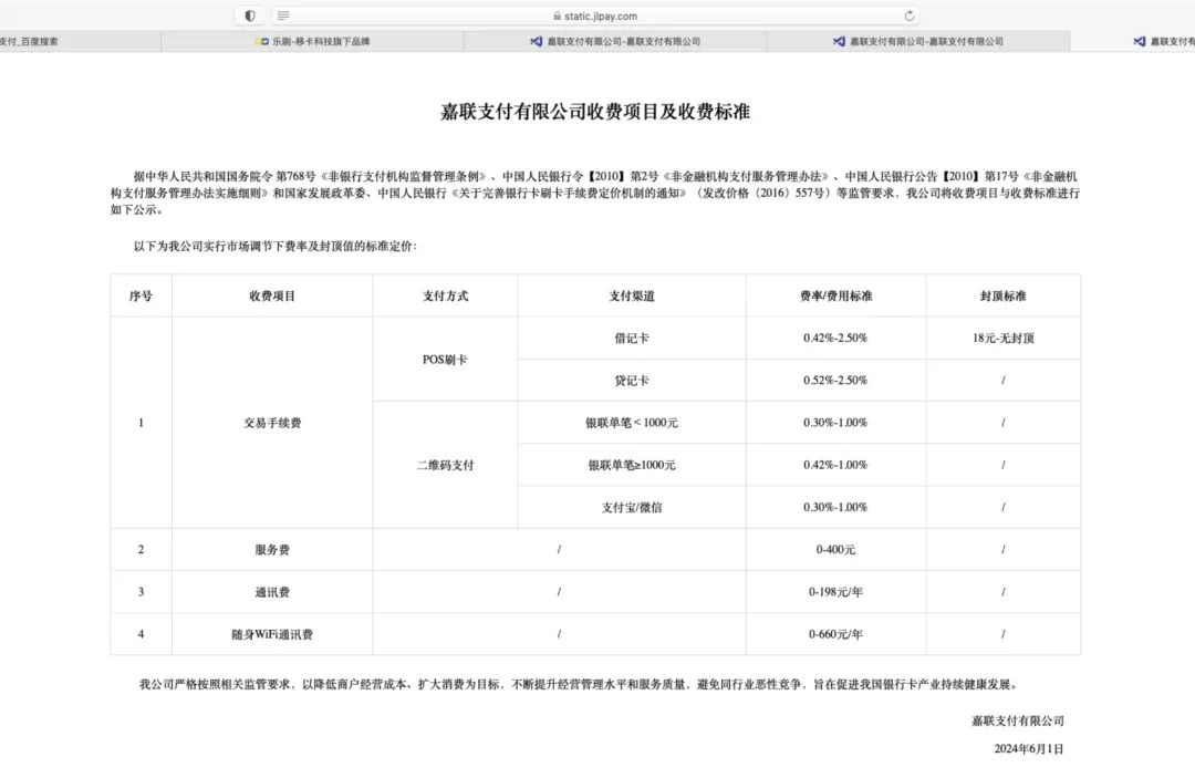 2024年6月1日,嘉联官网发布《收费项目及收费标准》,其中贷记卡POS交易费率最高2.5%、扫码交易费率最高1%。